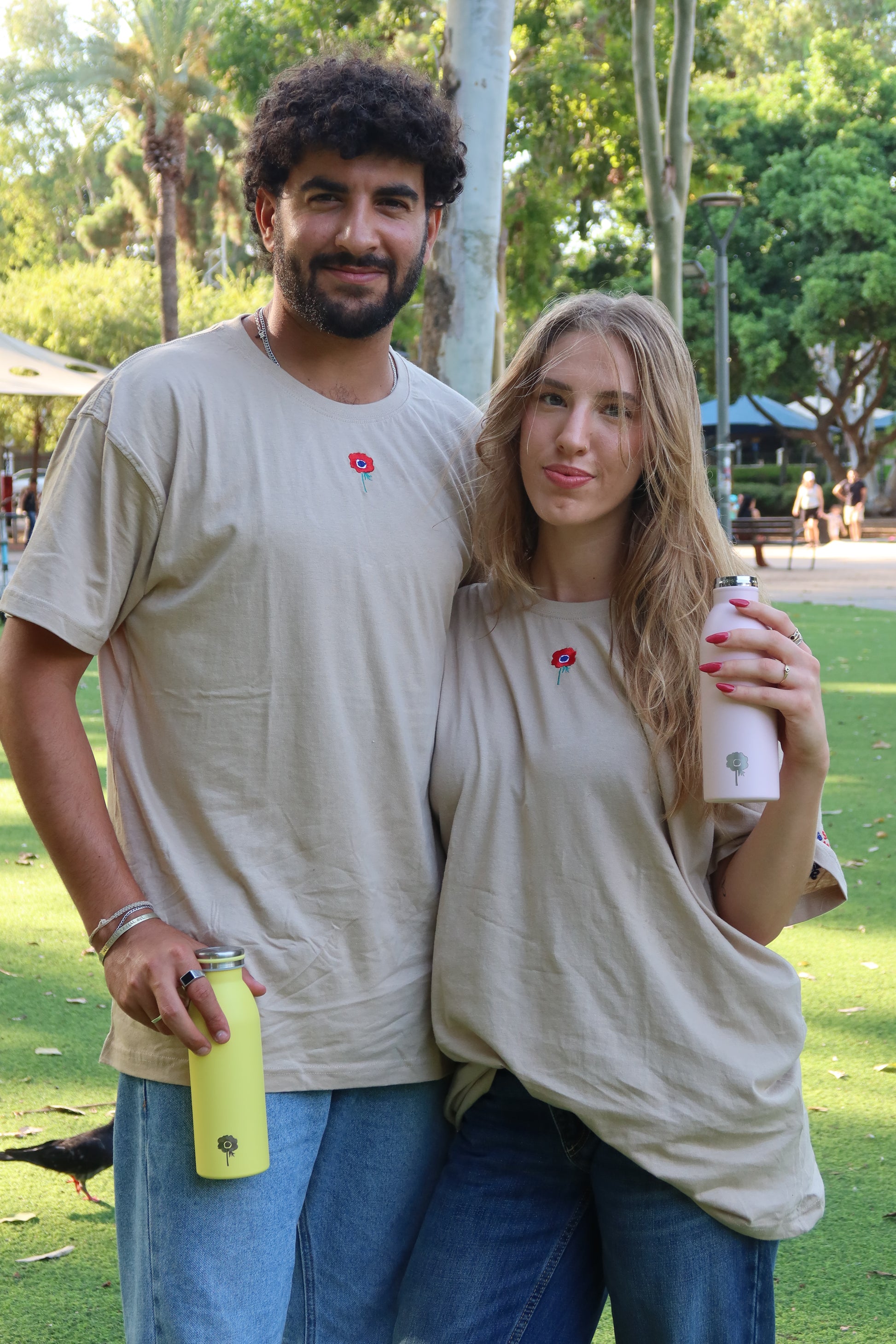 100% Cotton T-shirt in black or sand color. Front – embroidered red anemone (kalanit). Sleeve – embroidered text: we shall thrive again Soft cotton fabric, unisex fit.